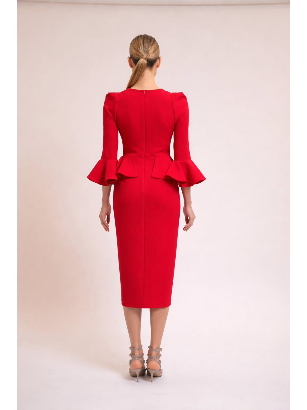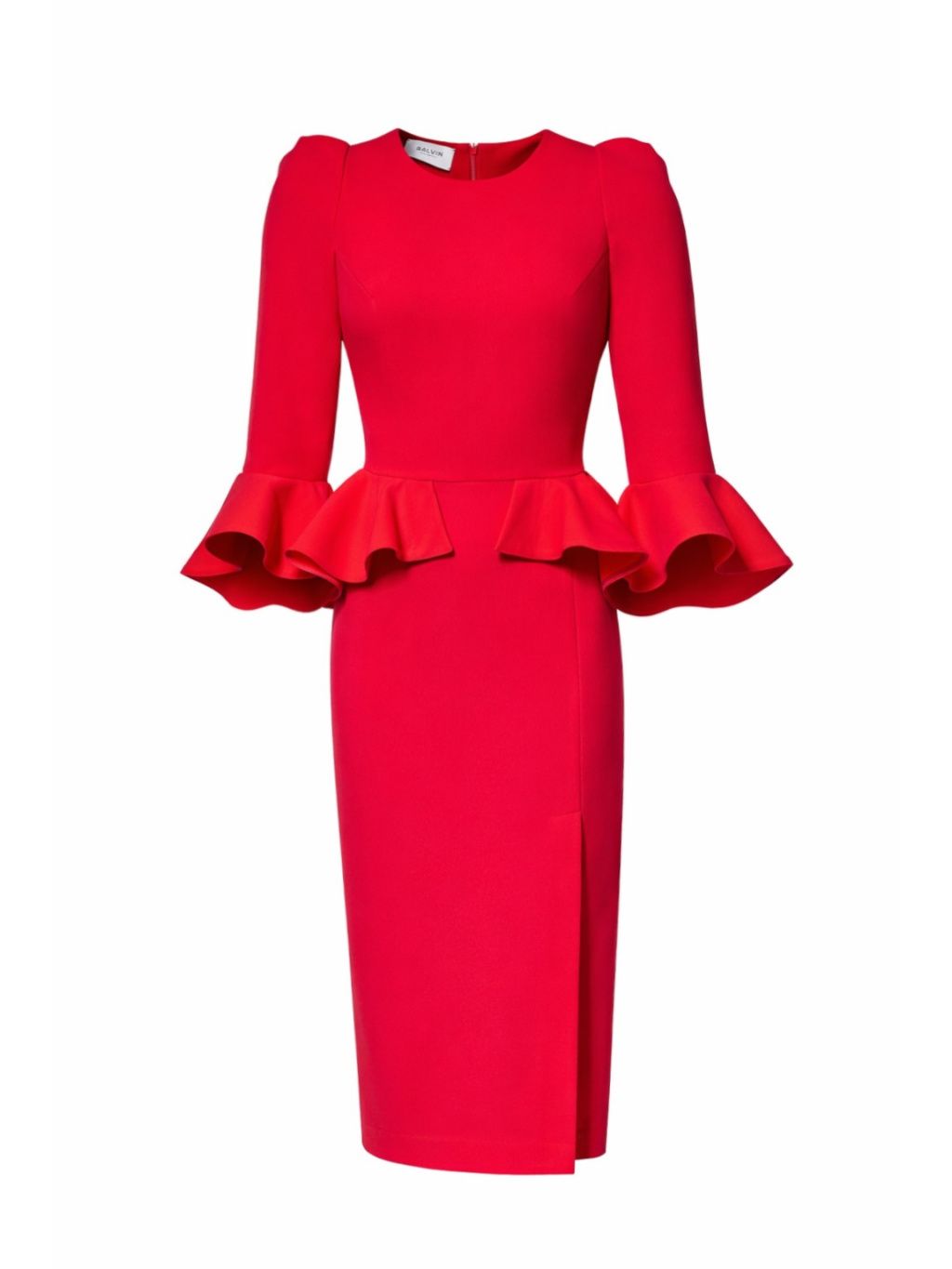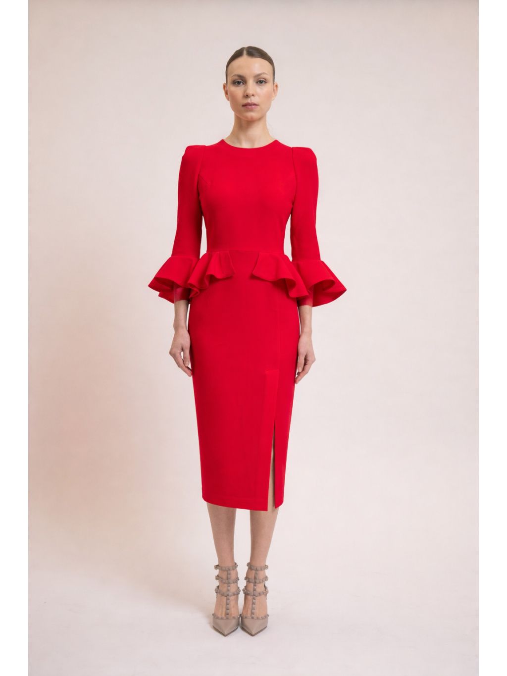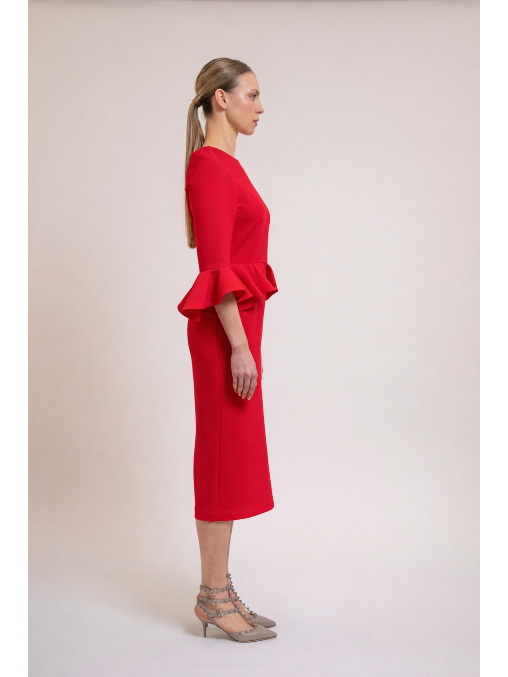Precizně střižené šaty, které díky elegantním raglánovým rukávům a jemnému volánku na manžetách krásně zvýrazňují postavu. Decentní peplum v pase podtrhuje siluetu a opticky zeštíhluje oblast pasu. Hladká sukně s předním rozparkem dodává modelu moderní eleganci, zatímco skrytý lemovaný zip zajišťuje dokonalé zapínání bez narušení linie šatů.