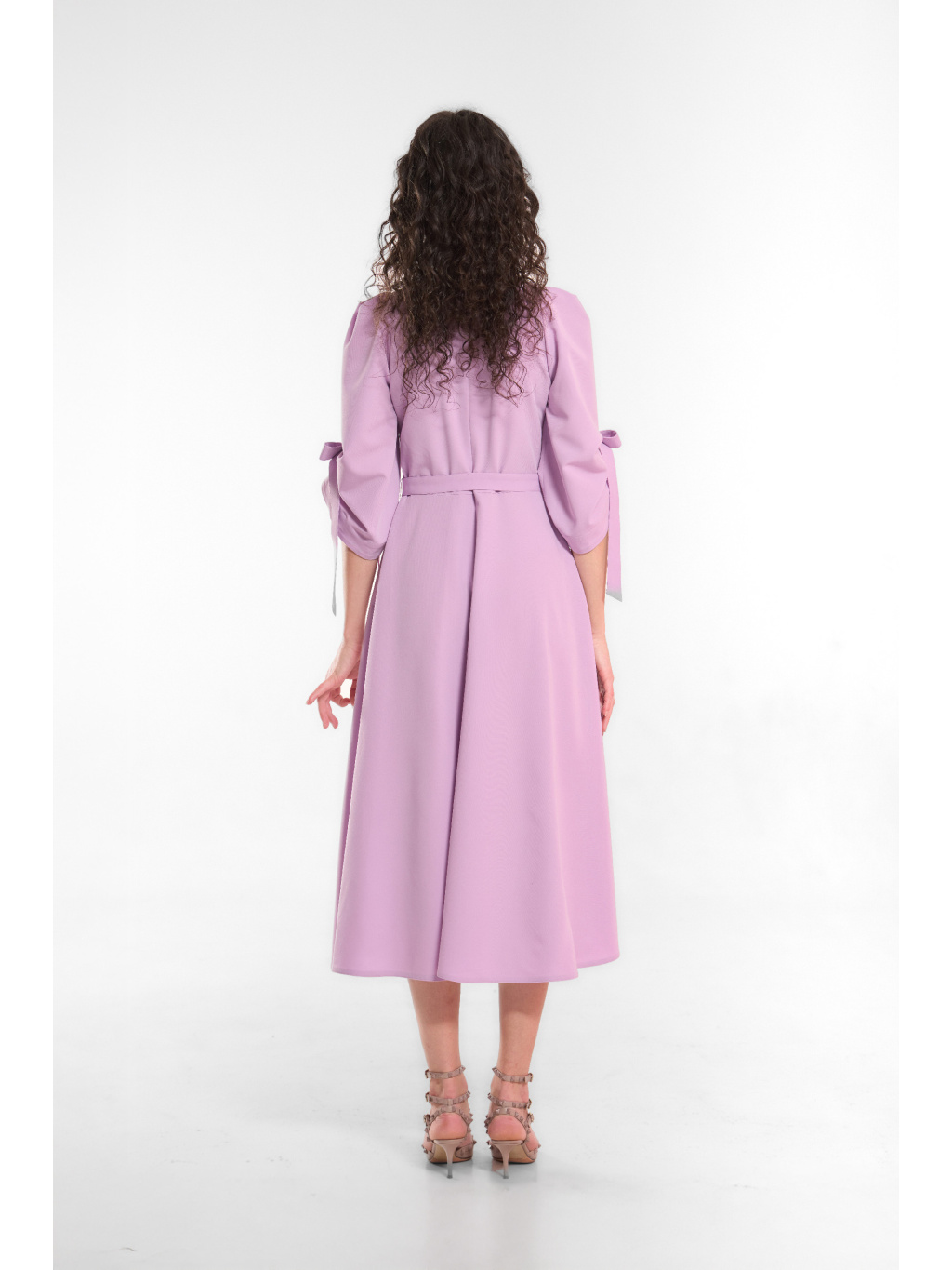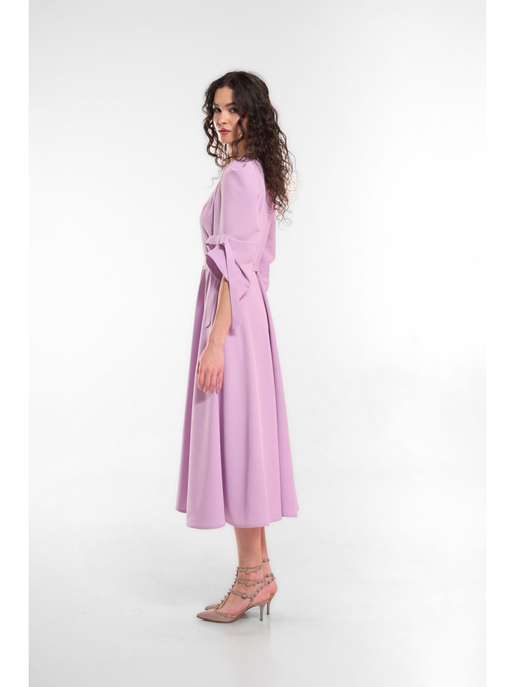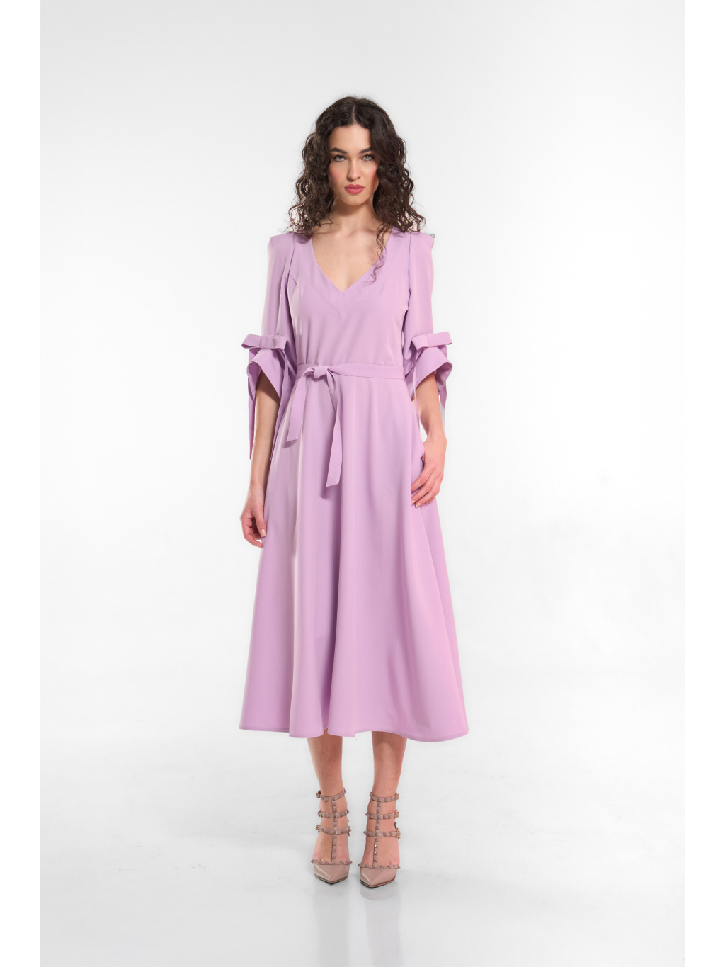 Tkané šaty s výstřihem do "V" a raglanskými rukávy, které opticky zaštíhlý postavu a ve kombinaci s pulkruhovou midi sukní a vytvoří příjemnou siluetku přesýpacích hodin. Rukávy mají volnější střih a designovými sklady a krásně vypracovanými tkanicemi v podobě mašlí. Šaty se zapínají skrytým podšitým zipem a v pase je přepásané páskem ze stejného materiálu.