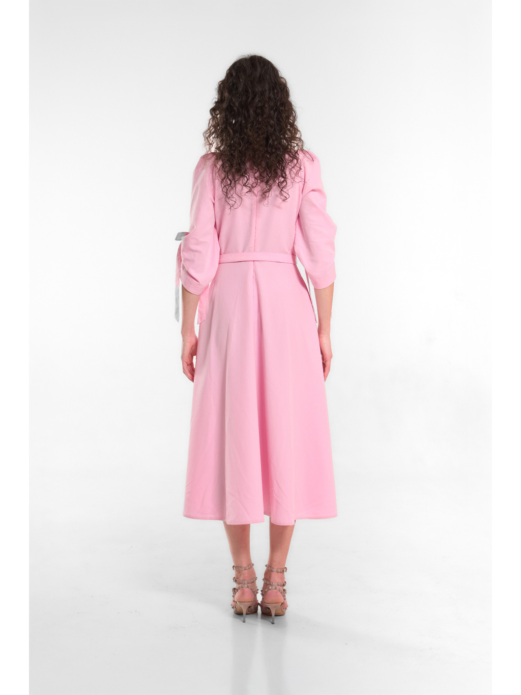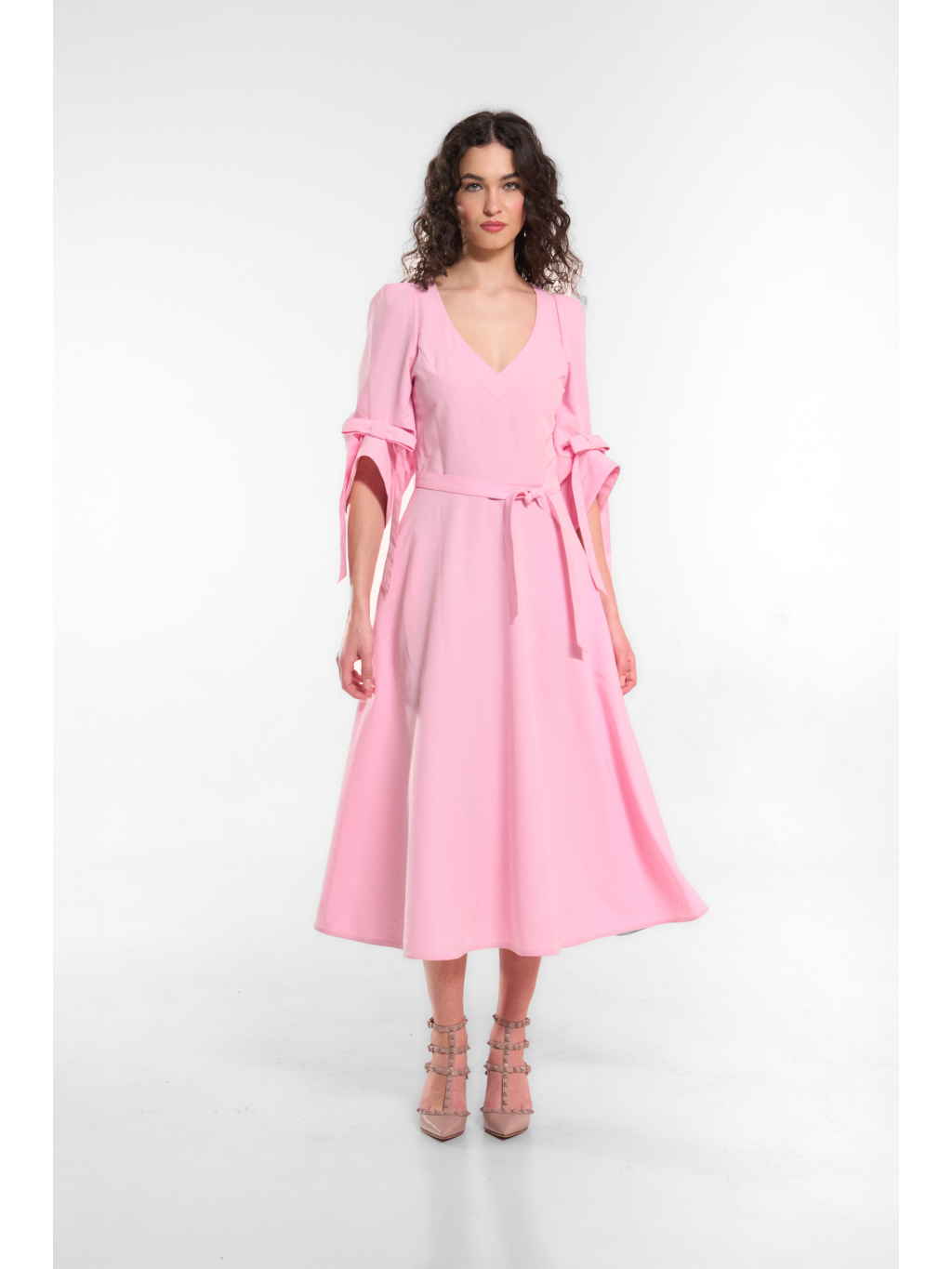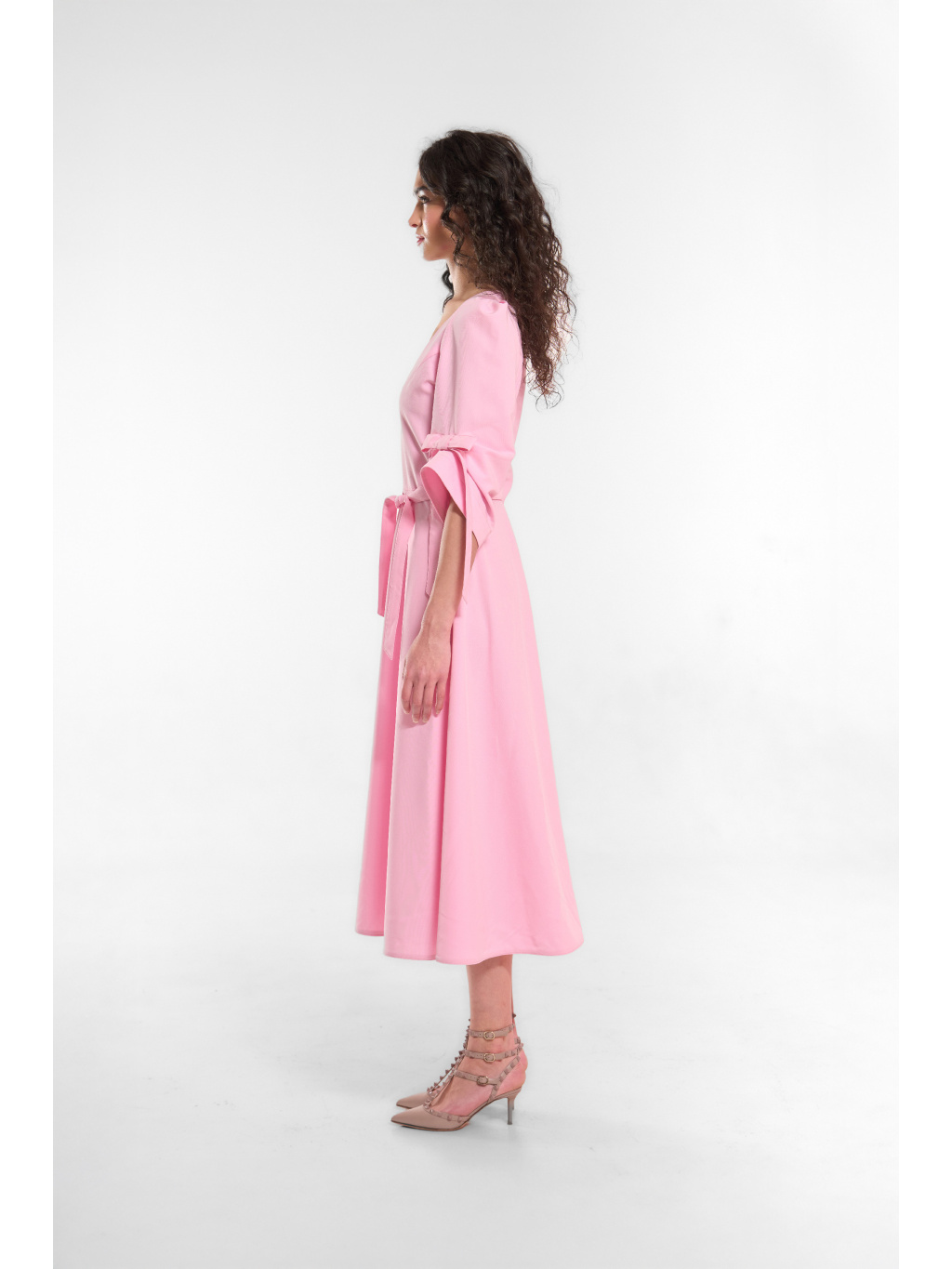 Tkané šaty s výstřihem do "V" a raglanskými rukávy, které opticky zaštíhlý postavu a ve kombinaci s pulkruhovou midi sukní a vytvoří příjemnou siluetku přesýpacích hodin. Rukávy mají volnější střih a designovými sklady a krásně vypracovanými tkanicemi v podobě mašlí. Šaty se zapínají skrytým podšitým zipem a v pase je přepásané páskem ze stejného materiálu.