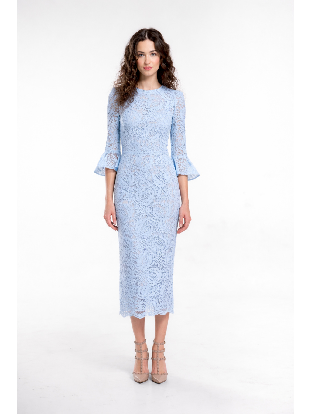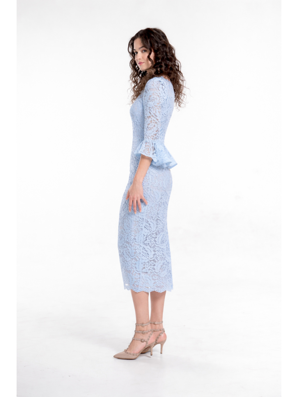 Krajkové pouzdrové šaty s raglanskými i rukávy zakončenými asymetrickým volánkem a úzkou sukní.